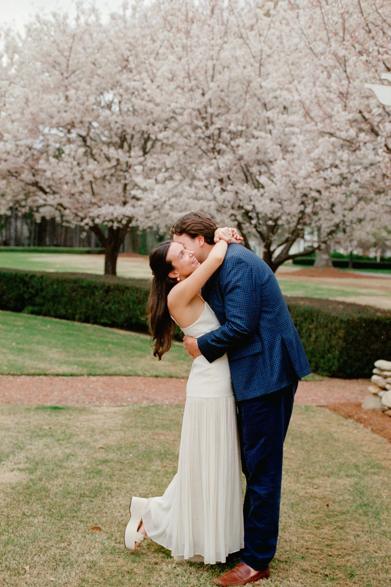 I photographed with a mixture of digital and film cameras, which is my favorite way to document a couple’s story. Blending mediums provides versatility and timelessness. For film, I used Kodak Portra 400 — my go-to film stock for engagement and weddings for soft contrast, true-to-life colors, and tight grain. There’s a depth and nostalgia in film, while digital allows moving quickly and capturing all candid interactions as they unfold.